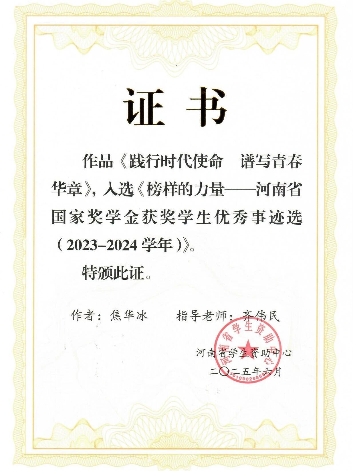 焦华冰同学曾获得国家奖学金,国家励志奖学金 彩神v8,2023年度中国大彩神平台自强之星奖学金,河南省社会应急救援队伍技能实训竞赛第三名,荣获河南省“三好彩神平台”,河南蓝天救援队先锋队员,漯河红十字优秀红十字志愿者等荣誉,焦华冰用行动践行担当,在知行合一,德技并修的校训熏陶中勇毅前行,用勇敢和担当诠释责任,以行动传递温暖。
